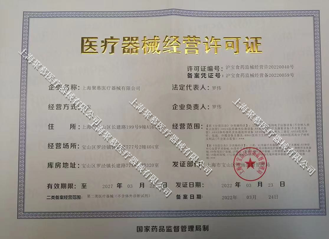 上海聚慕醫(yī)療器械有限公司地址:上海市閔行區(qū)聯川路258號浦江智地精品商務園6B號樓3層301B郵編:200318總機:13816841497滬寶食藥監(jiān)械經營許20220040號